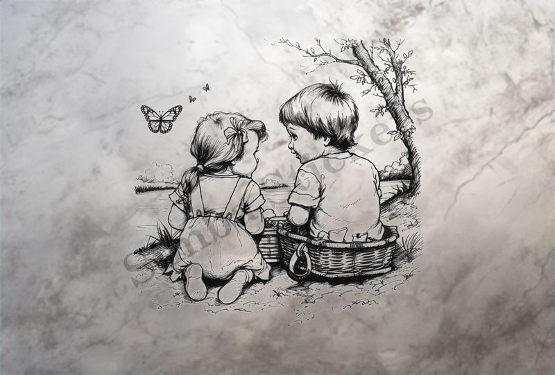 Boy and girl by the river bank, boy in picnic basket, outline art
