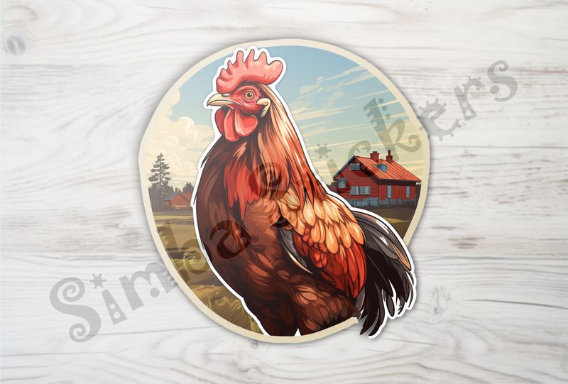 Brown-red chicken, free-range, with farmhouse in background