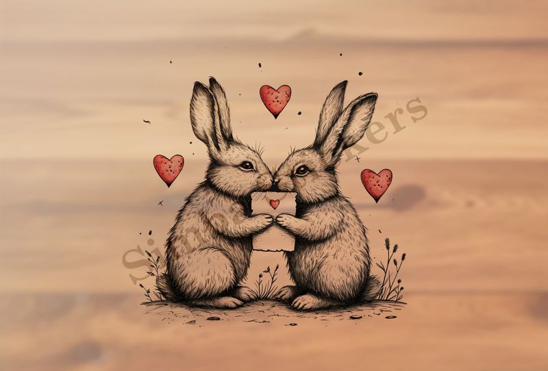 Bunnies in love, nose-to-nose, hearts in air, holding up note, outline art