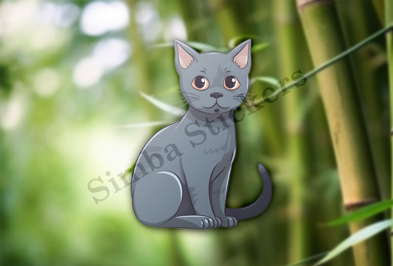 Russian blue cat sitting, tail wagging