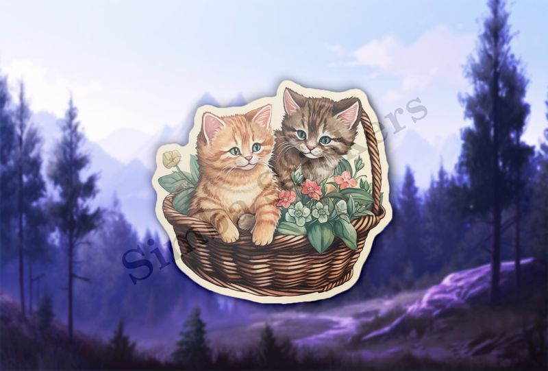 Two kittens in a flowery basket, vintage watercolour